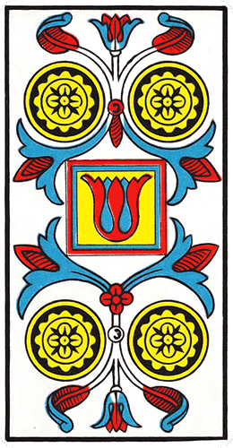 Avec le Quatre de Deniers, on a l’impression de regarder un mandala même si la figure ne se présente pas sous la forme d’un cercle. La mise en place des éléments dessinés est géométrique. Elle permet à la figure, comme le mandala des bouddhistes, de servir de support à la méditation, car l’effet hypnotique du Quatre de Deniers est particulièrement fort. La carte symbolise la nécessité de prendre le temps de se concentrer sur soi pour mettre de l’ordre dans sa vie et se donner toutes les chances d’atteindre la perfection.