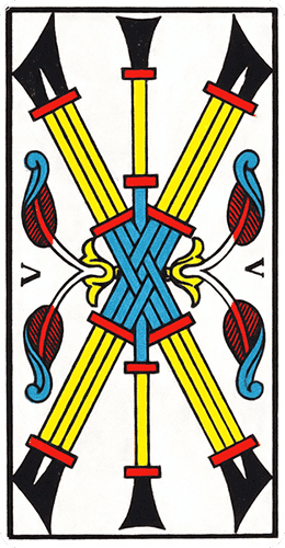 Le Quatre de Bâton était le symbole des habitudes dans une vie sécurisée, le Cinq de Bâton, par son cinquième bâton dérange la routine et introduit dans la carte une envie d’autre chose, de dépassement.