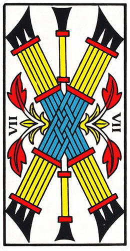 Le Sept de Bâton symbolise nos élans vers les quatre coins de l’univers. Il représente aussi la variété des nourritures terrestres et célestes qui viennent renforcer notre motivation à nous perfectionner.