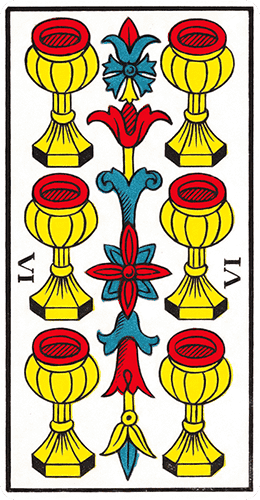 Le Sept de Coupe nous invite avant tout à chercher le dépassement de soi par le biais des sentiments et de la créativité. Cette carte nous dit que ce qui permet à l’homme de s’élever est la richesse et la profondeur de ses sentiments et de ses émotions. Dans la carte du Tarot de Marseille, règne une atmosphère de sérénité et de joie dans le mouvement. Finalement c’est le bonheur que le Sept de Coupe nous promet.