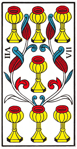 Deux séries horizontales de trois Coupes occupent le haut et le bas de la carte. Le nombre Trois se retrouve encore avec les trois Coupes centrales alignées verticalement. Le Trois si présent dans la carte du Sept de Coupe insiste sur le fait que la rivalité (présente dans le Deux) est surmontée.