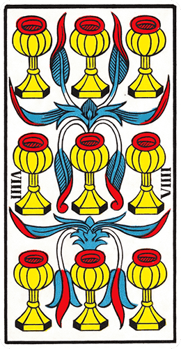 Si c’est le mouvement ascensionnel que vous voyez le mieux dans le Neuf de Coupe, c’est que vous êtes porté par un certain optimisme. Mais si c’est les feuilles de la plante fanées qui attirent votre regard, posez-vous la question de savoir si vous êtes satisfait de la vie que vous menez actuellement.