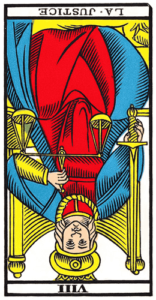 La Justice en inversé dans le présent signifie qu’un problème grave survient : soit à cause d’un acte de Jean, de son manque de prévoyance, de sa volonté inconsciente de rester dans l’insouciance de la jeunesse. Soit à cause d’une tierce personne, qui cherche à le duper, à profiter de lui. Jean se retrouve dans une situation inconfortable et déséquilibrée. Suivant la gravité du problème, La Justice peut s’en mêler. Jean a perdu ses repères, son plaisir à vivre.