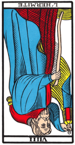 La dernière carte tirée, placée entre les deux autres, l’Hermite, conseille au consultant de faire preuve de patience, son attente sera longue mais il doit faire montre de persévérance dans ses recherches.