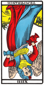 Tempérance inversée est négative. Laure ressent un grand mal-être, sa santé est déréglée, son rythme de vie est heurté, c’est comme si on lui avait coupé les ailes. Elle est en prise avec des sentiments contradictoires. Elle mesure exagérément l’ampleur de son mal-vivre et se sent abandonnée de tous.