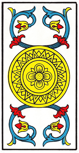 Le Denier est fait d’or, symbole de richesse et d’abondance, de lumière et de chaleur. L’As de Deniers est une valeur précieuse. C’est une carte positive, bienfaitrice.