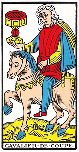Arcane mineur du Tarot de Marseille de la suite du Coupe, le Cavalier de Coupe annonce généralement un changement sentimental profond et durable.