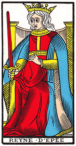 Enfin la Reine d’Epée est celle qui a le moins bon caractère et une sociabilité réduite. Elle place au-dessus de tout l’intelligence et la réflexion.